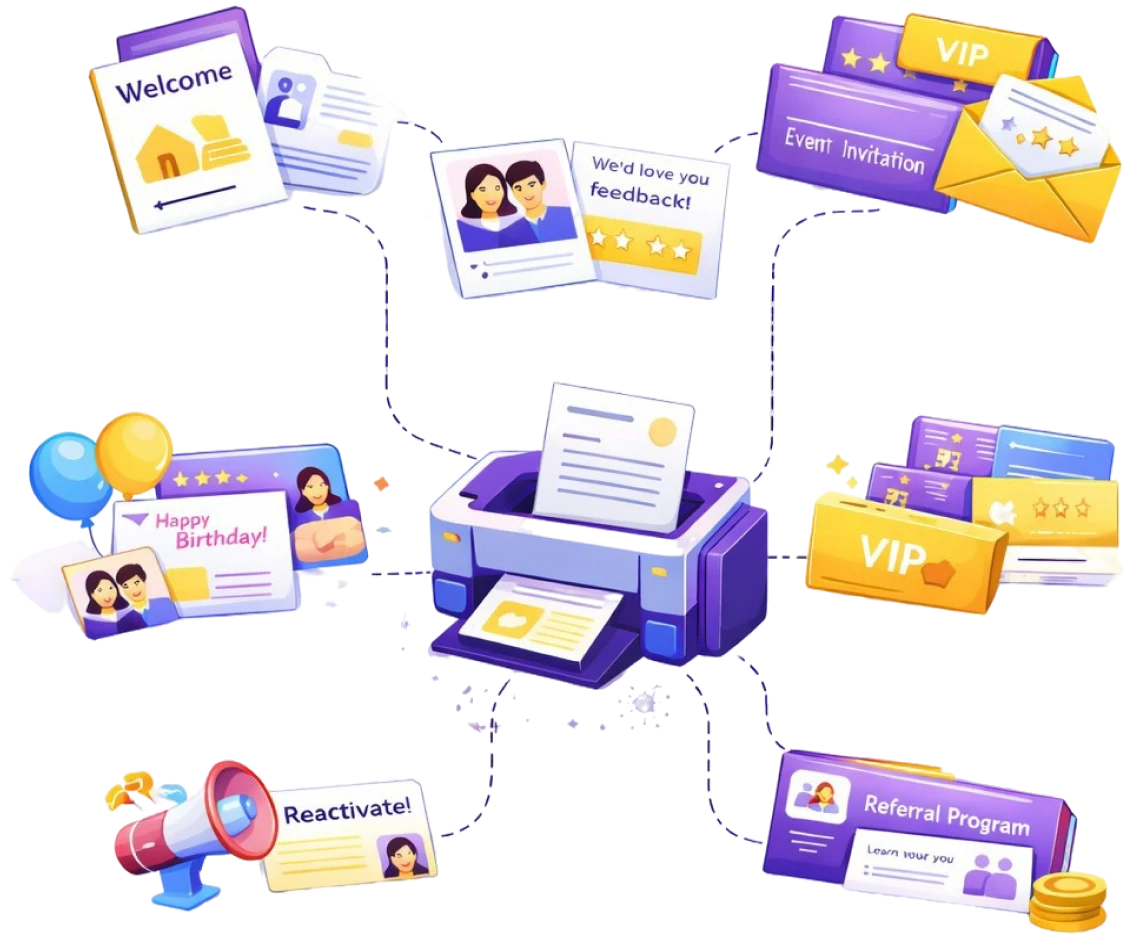 We create automated physical mail sequences postcards, letters, offers, reviews, and follow-ups that sync with email and SMS to keep clients engaged year-round.